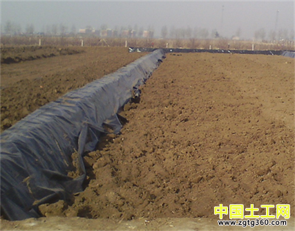 3、從沒有堆土的一面繼續(xù)取土20公分置于已經鋪設的專用防滲膜面上,然后平底鋪膜,就這樣一直挖土填土到規(guī)劃的位置。膜邊重疊要求在10-15公分,由技術人員用焊接方式處理。